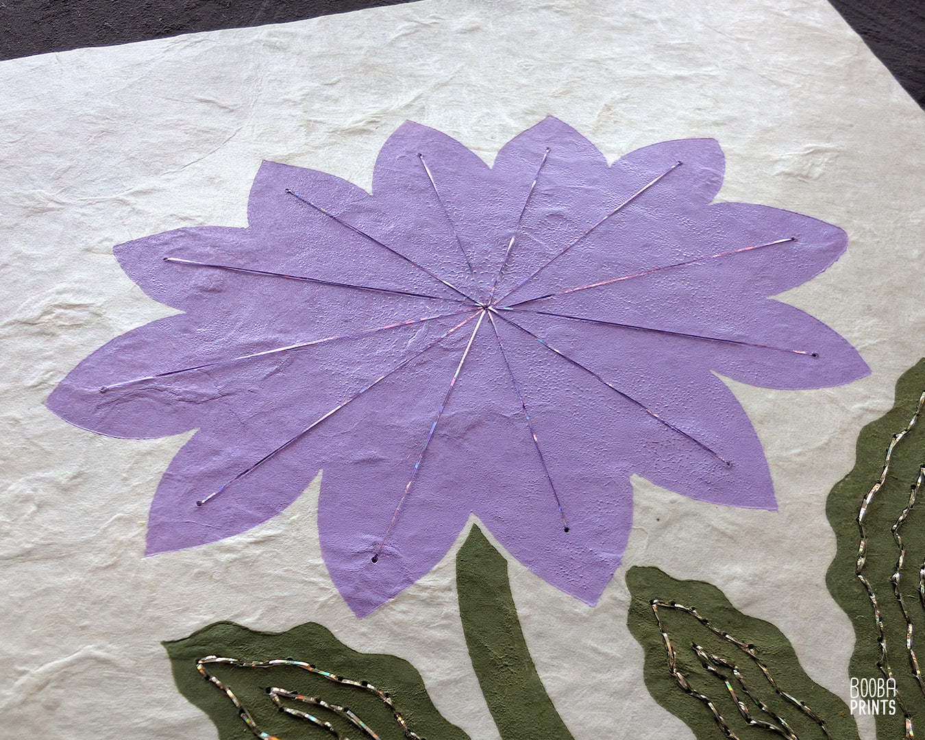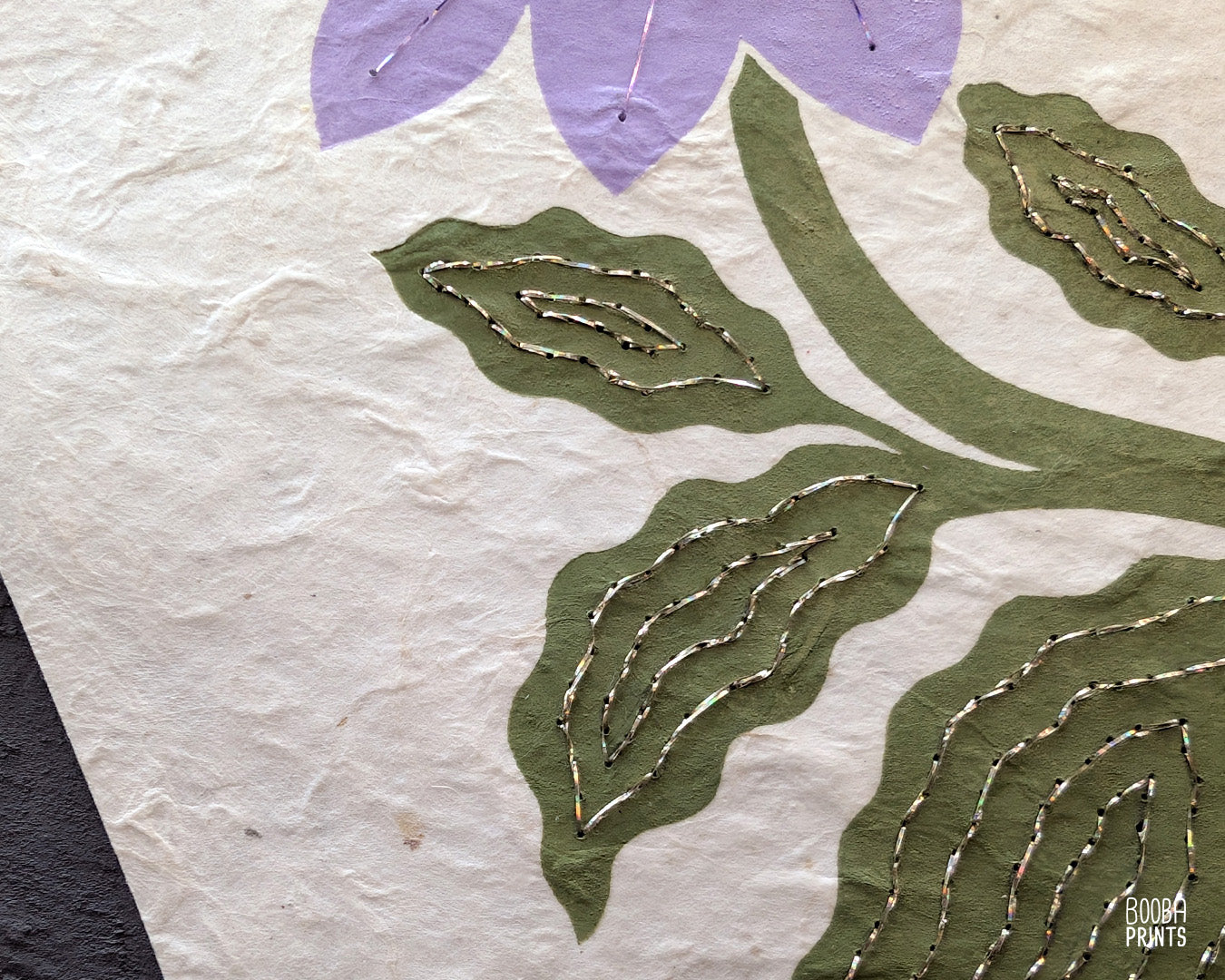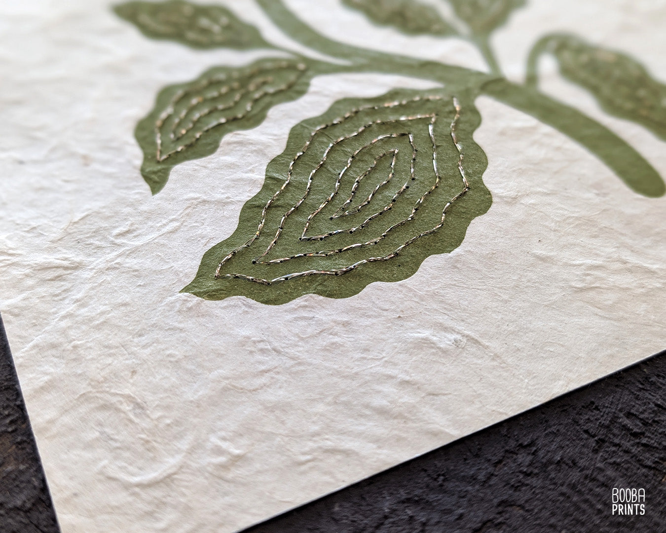 Lokta paper 90 gsm, oil based ink, embroidery thread