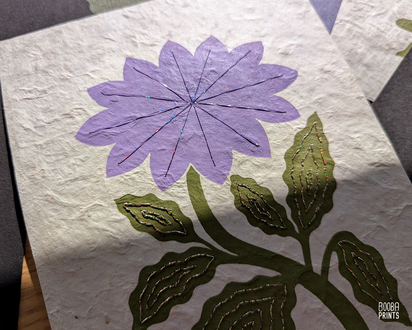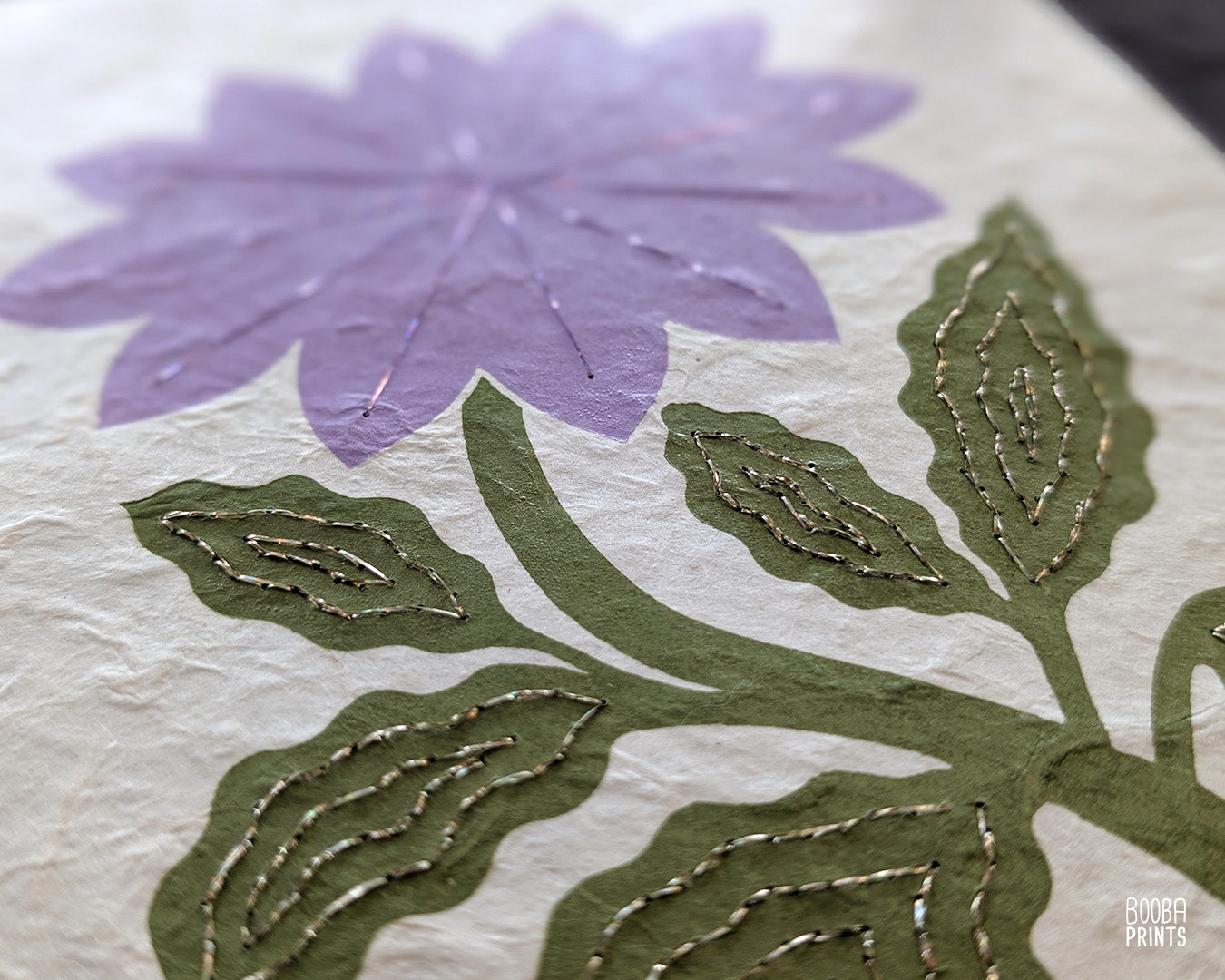 Flower Linocut Print Green & Purple Stylized "Diamond Flower" ✷ Hand Embroidered Original Artwork