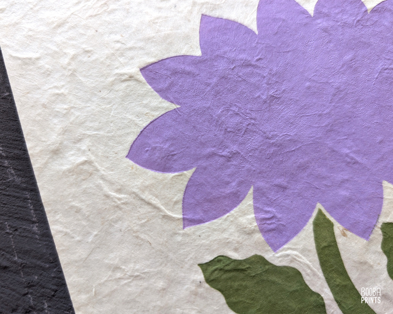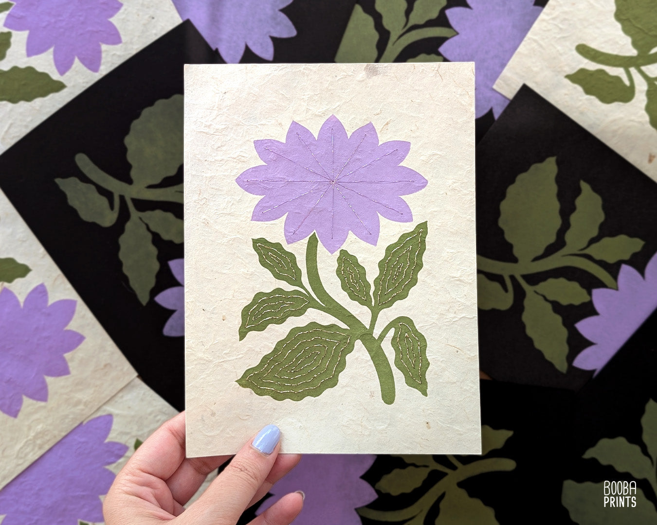 ⭐ Diamond Flower is a handmade floral linocut print featuring stylized flowers in beautiful green and vibrant purple. This is part of my series of botanical, embroidered, original, mini prints. Each piece is carved, inked, and printed by hand, celebrating the textures and imperfections that make printmaking so special
