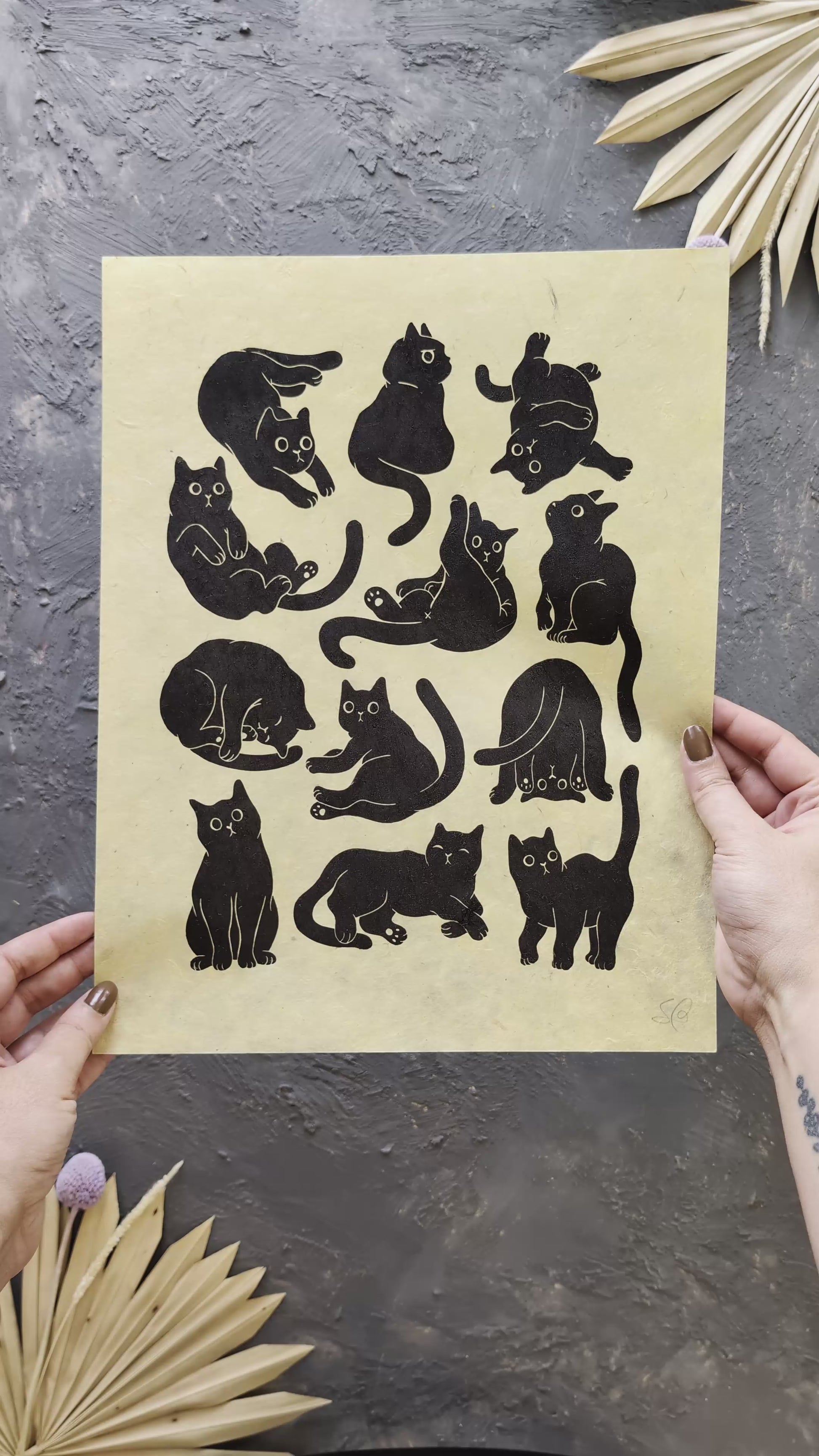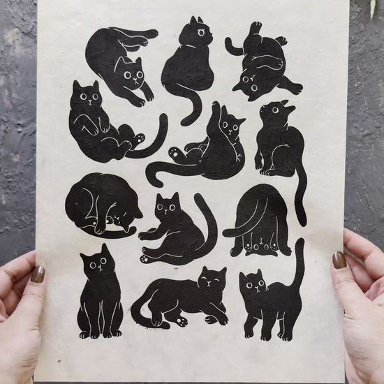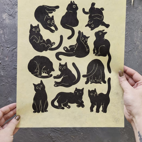 ⭐ Hand printed original linocut design of my 12 Cats print, printed in black ink on Yellow or natural Lokta paper. Featuring 12 different cats in 12 different poses.