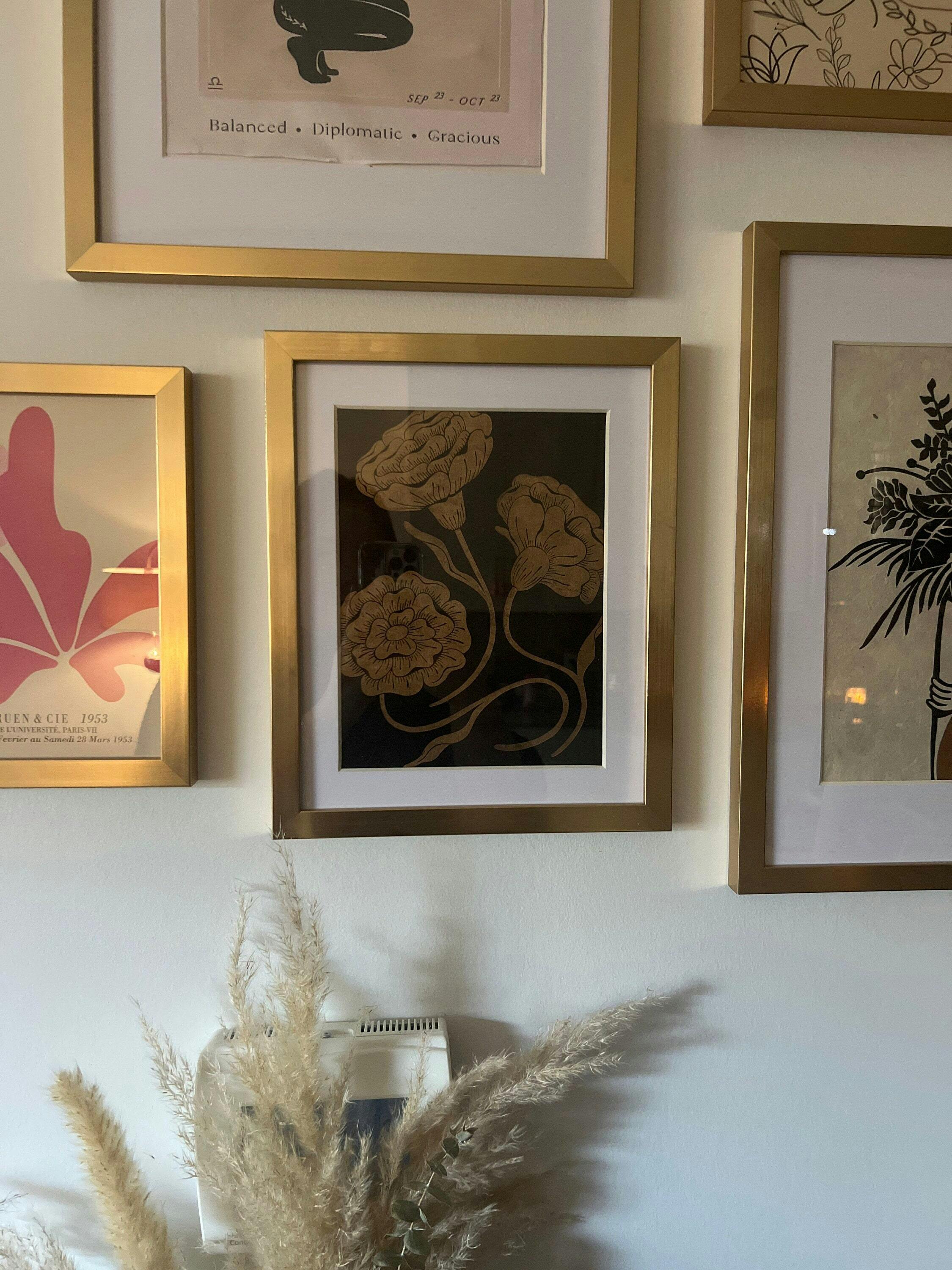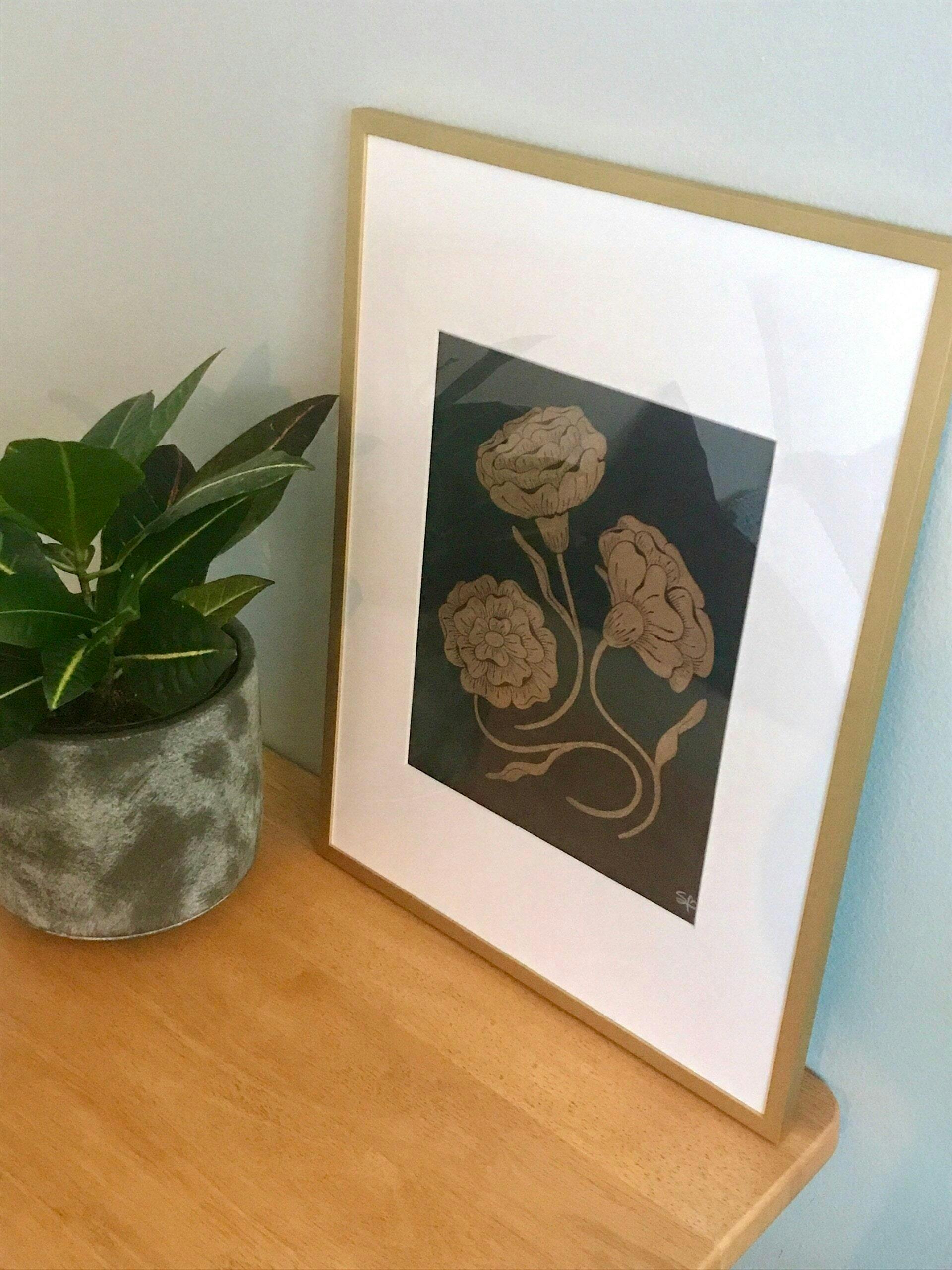 An original linocut print of 3 ethereal flowers. Printed with gold ink on black, natural or purple Lokta paper. Elegant touch for your space, or a beautiful gift for your flower lover friend.