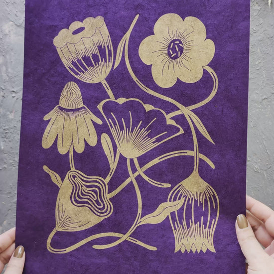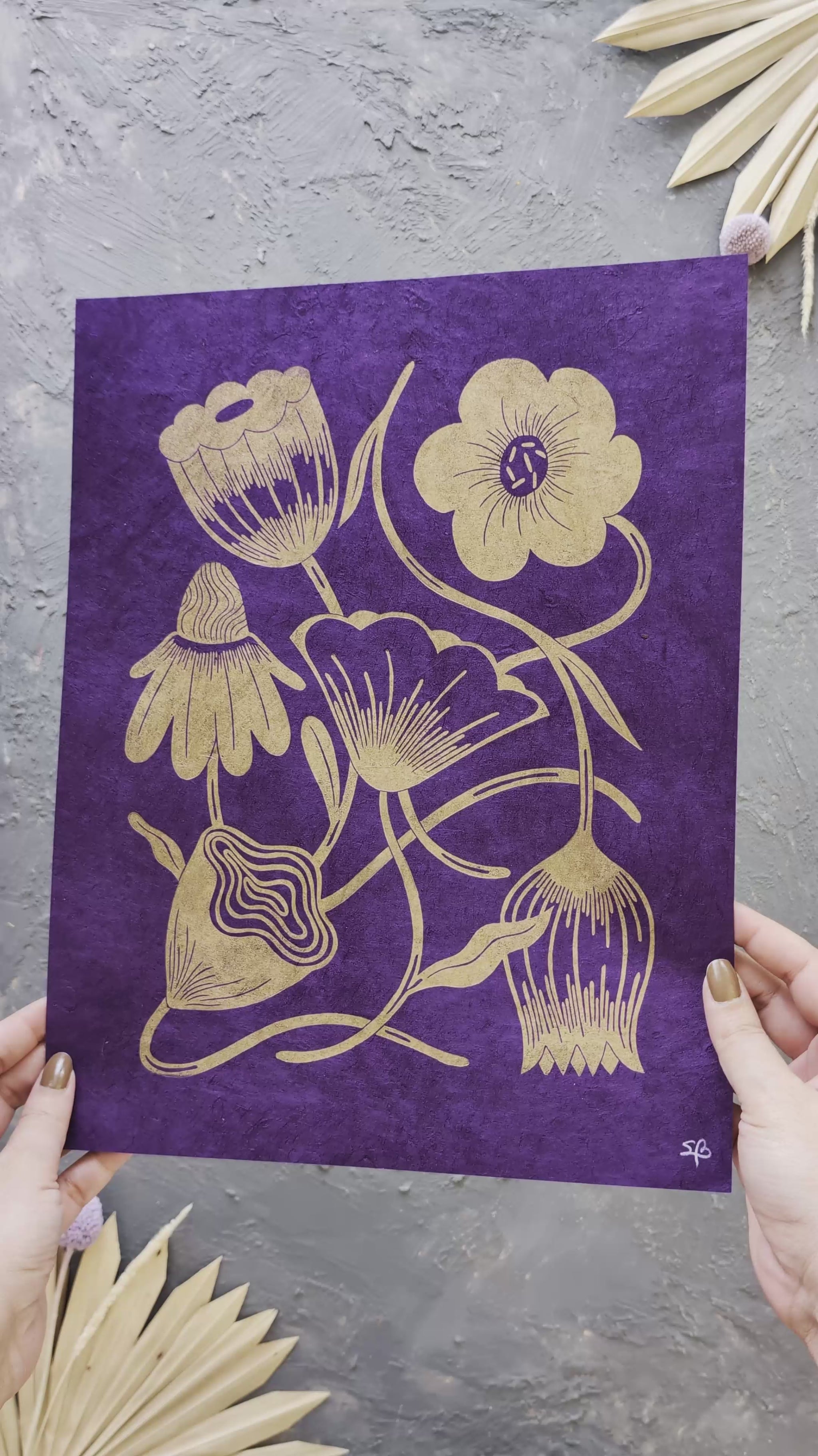 ⭐ My linocut print in my metallic gold flower series, printed with oil based ink on purple Lokta paper.