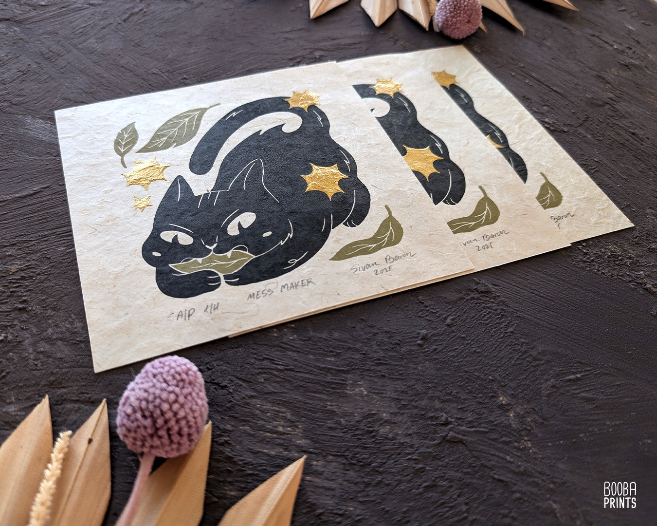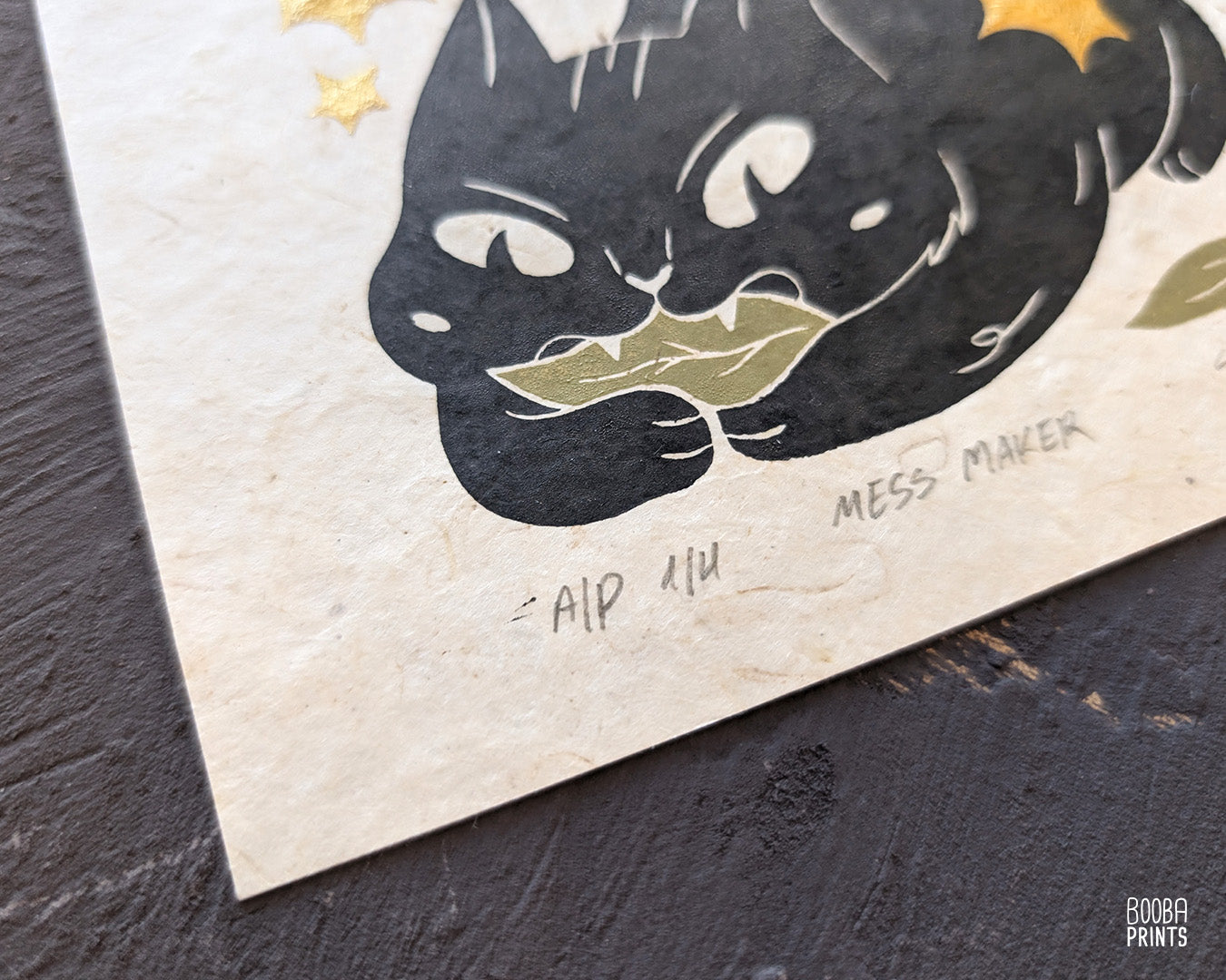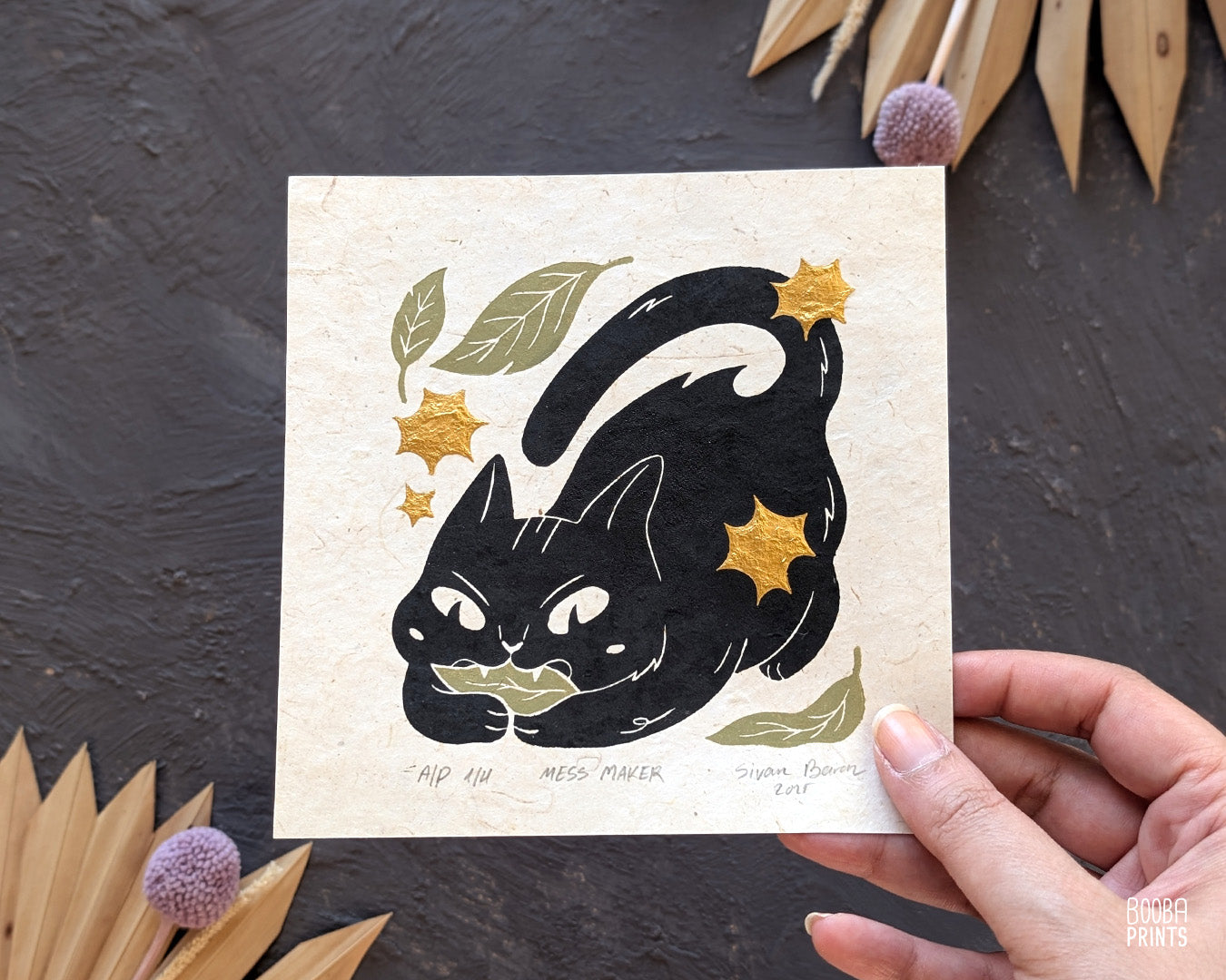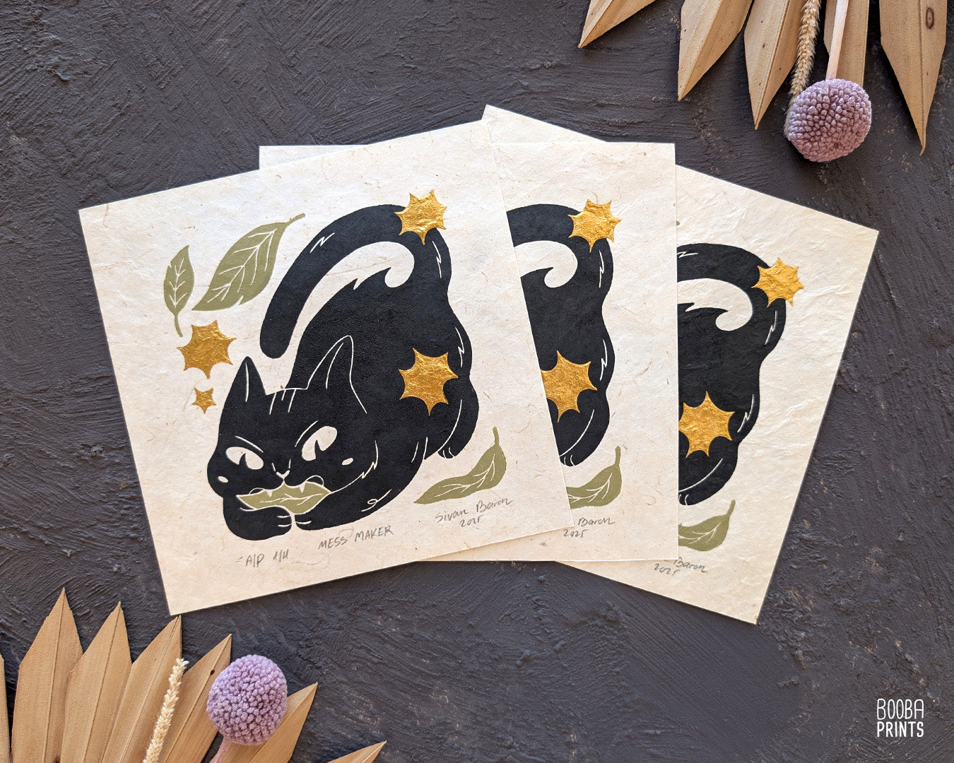 ⭐ This is an original handmade linocut print of my Mess Maker. Each print is carved and printed by hand, making every piece truly unique. Printed in 2 colors of green and black, and finished by hand with illuminating gold touches!