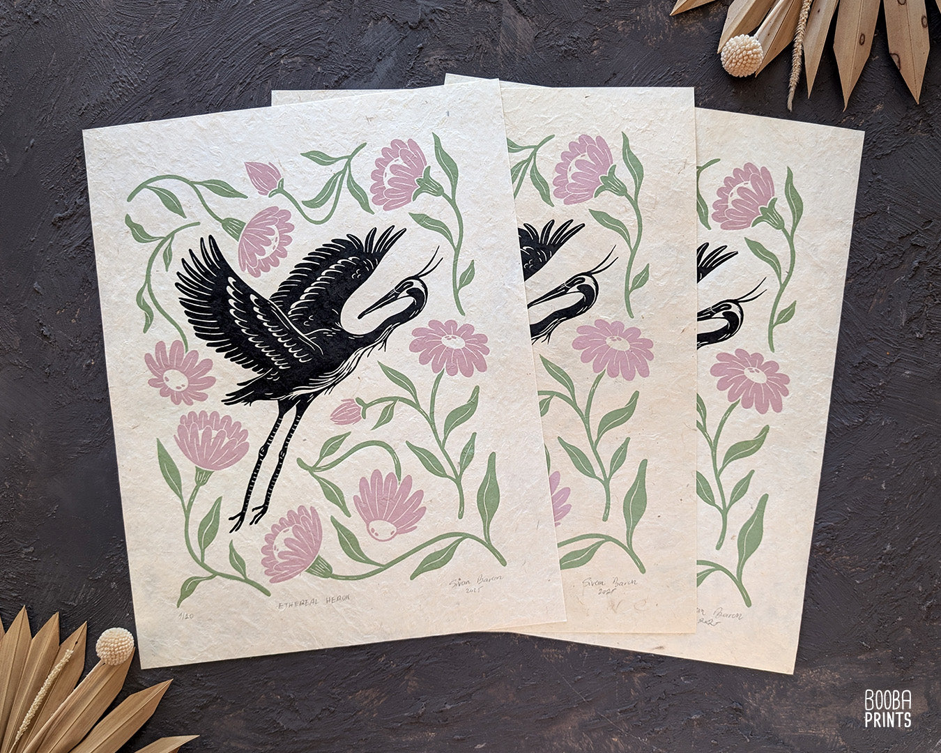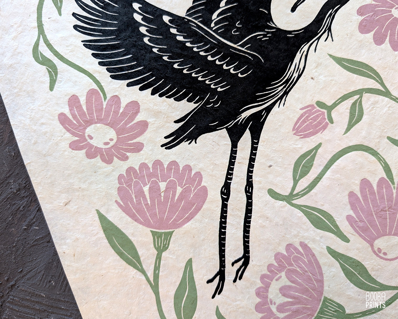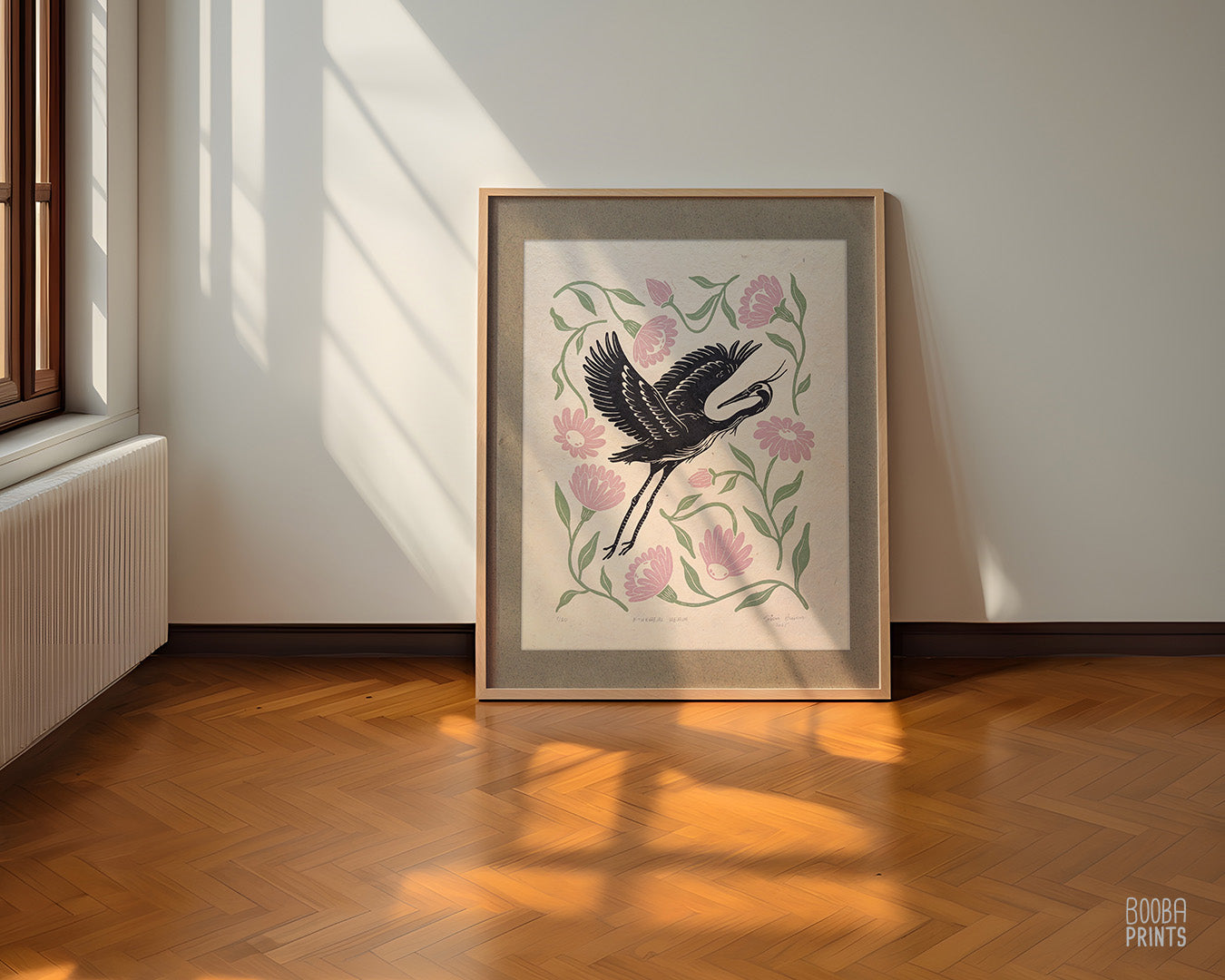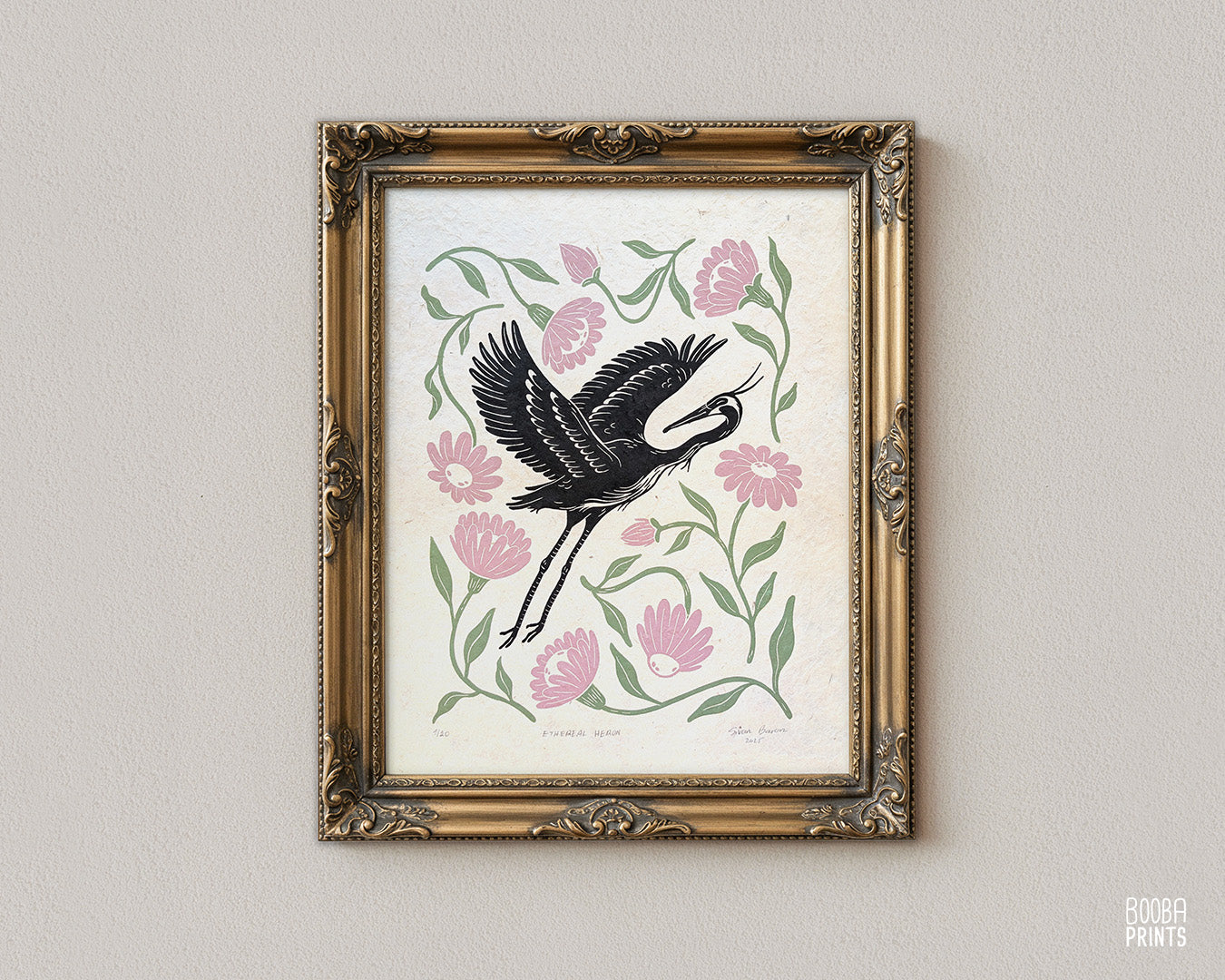 My Ethereal Heron linocut print is a stylized design of a graceful heron surrounded by delicate flowers. Perfect for bird lovers, nature enthusiasts, and anyone looking to add a unique touch of botanical art to their walls.