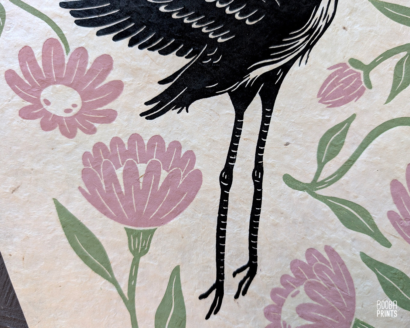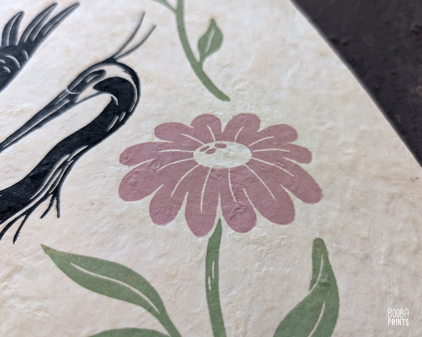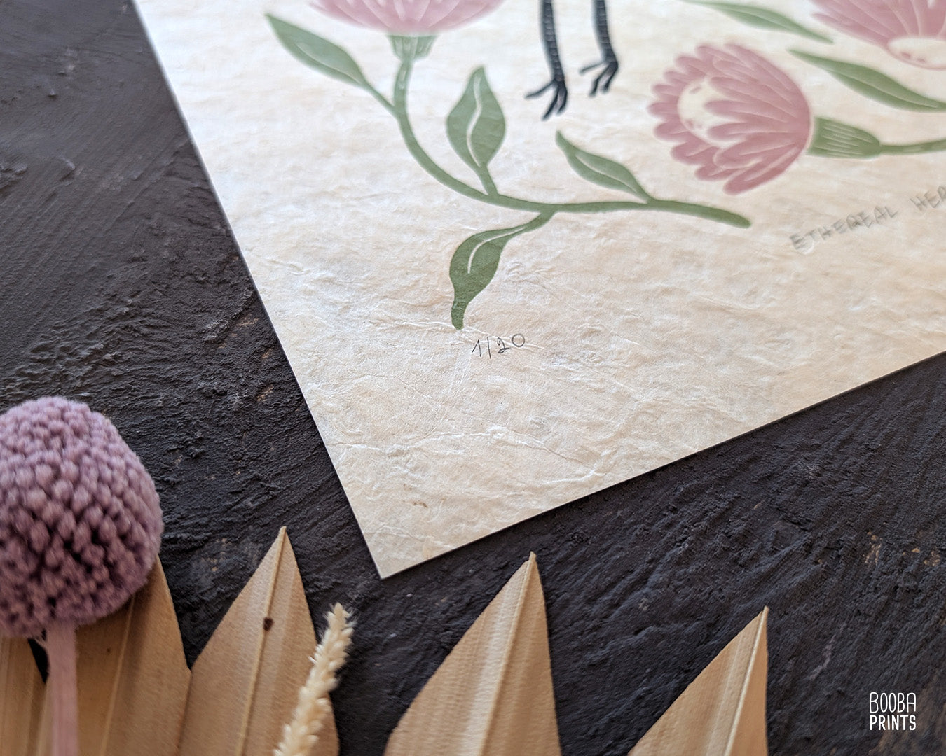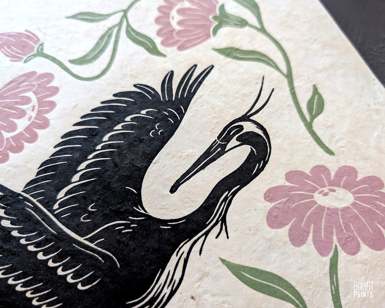 My Ethereal Heron linocut print is a stylized design of a graceful heron surrounded by delicate flowers. Perfect for bird lovers, nature enthusiasts, and anyone looking to add a unique touch of botanical art to their walls.