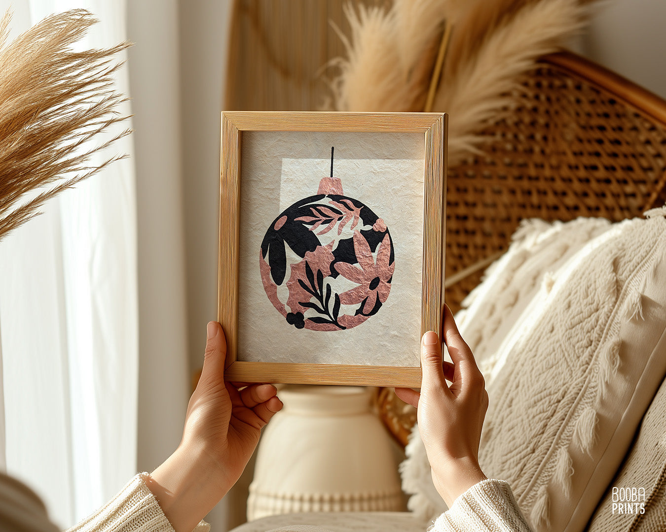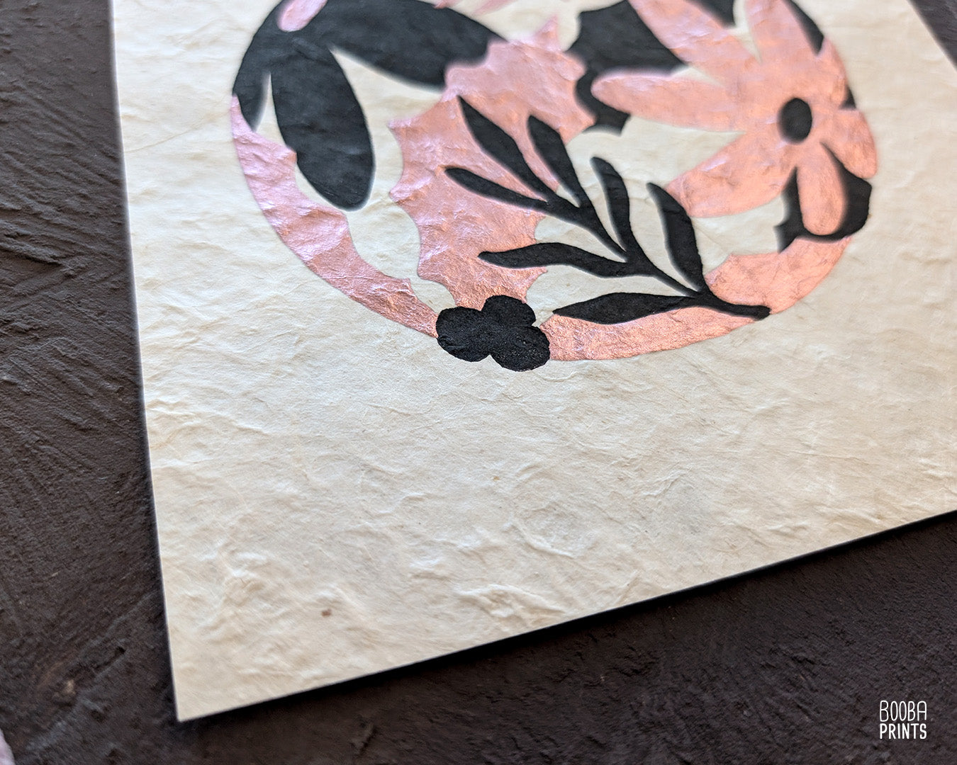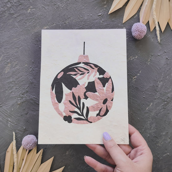 ⭐ This print was printed by hand with oil based ink in black, and then hand painted with metallic paint in rose gold, to create this unique floral Christmas art.
