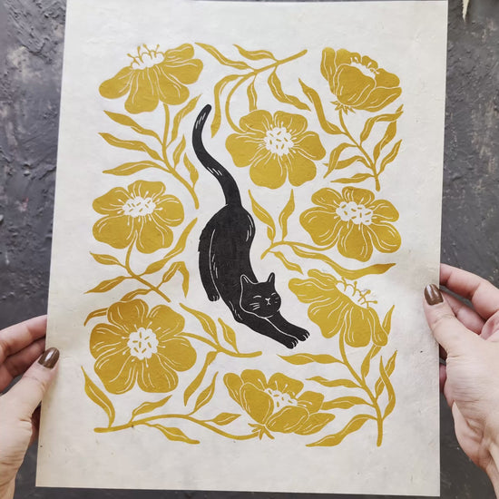 ⭐ Combining my love of cats and flowers once again! This Stretchy Cat linocut print is a true labor of love. From designing to carving and printing by hand.